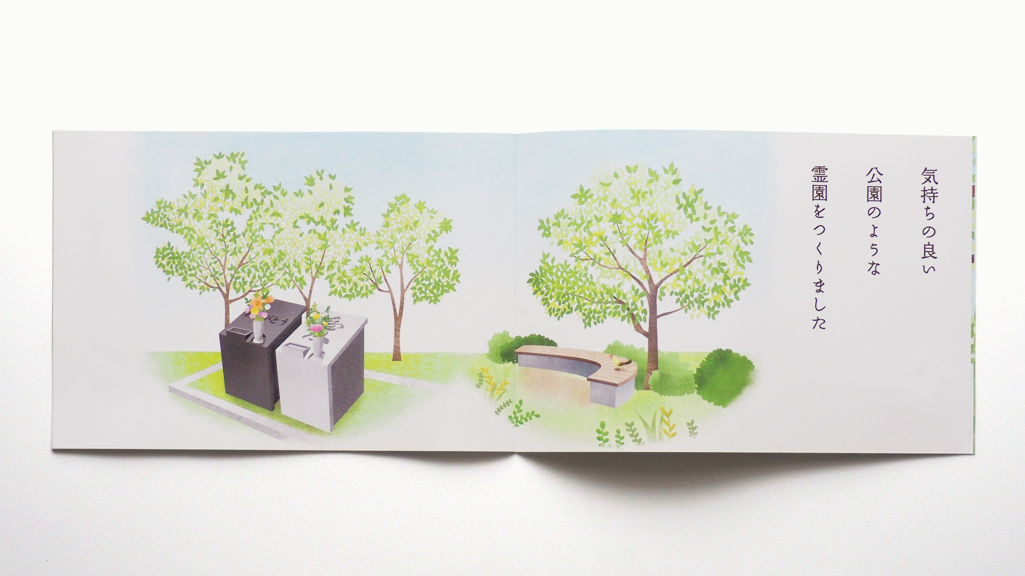 霊園パンフレット 霊園のブランドリーフレット内、イラスト制作。公園のような霊園を身近に親しみやすく伝えるために、やさしく明るいタッチで木漏れ日降り注ぐ空間を描きました。 illustrationCLIENT: 株式会社オクノART DIRECTOR: タイラーデザイン事務所WRITING: ぐるり舎YEAR: 2019